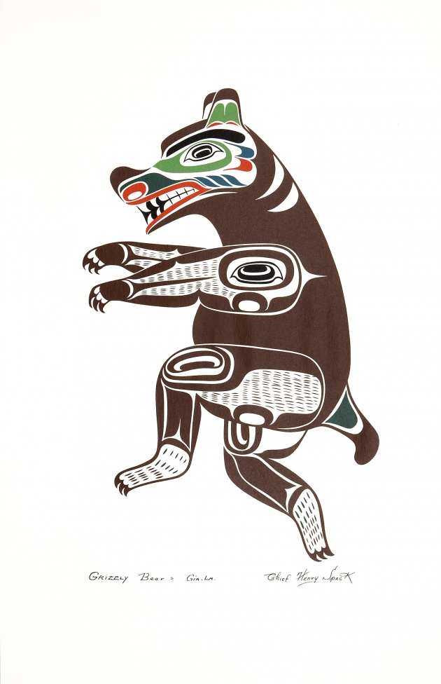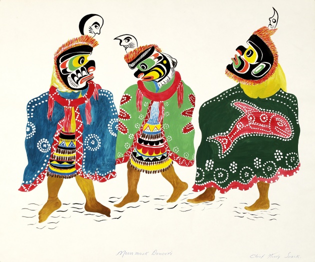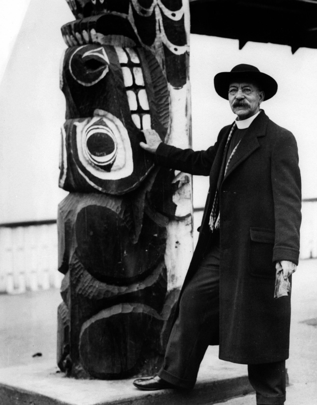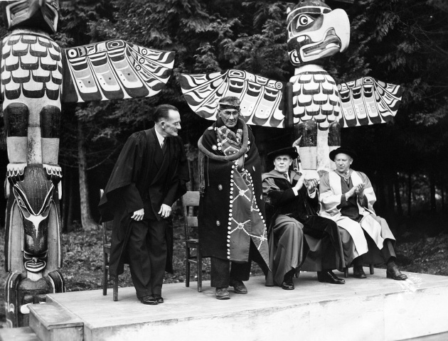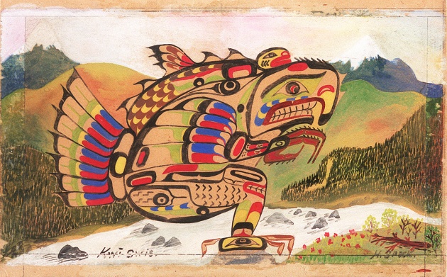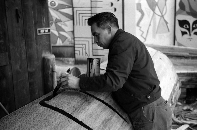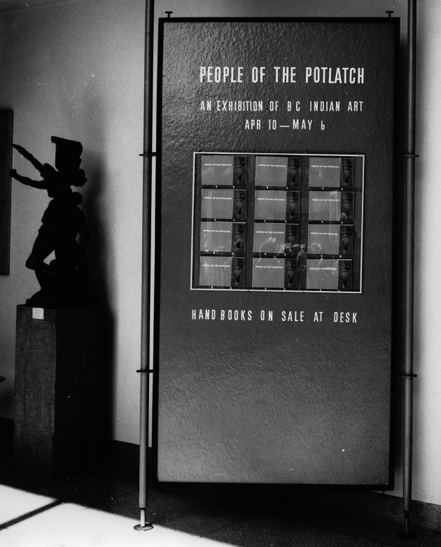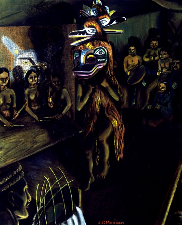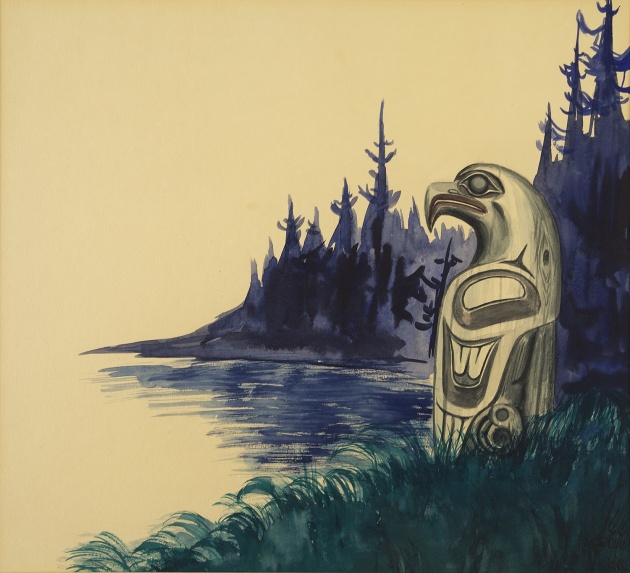 In the 1920s, when the “disappearance” of totem poles became a public concern, a Totem Pole Restoration project was financed by the Department of Indian Affairs (DIA). A committee was struck with the DIA Superintendent as Chair, and Marius Barbeau, chief ethnologist of the National Museum as one of the committee members. They focused on the poles near the Upper Skeena River, the lands through which the railway ran. Subsequently, the first of seven poles were cut down and put in cement blocks along the railway to promote tourism. During Barbeau’s work on the Skeena, he invited various artists to paint a “dying” way of life. An exhibition in Ottawa of their paintings, Canadian West Coast Art: Native and Modern, was curated by Barbeau and Eric Brown, director of the National Gallery, in 1927.
