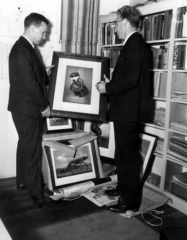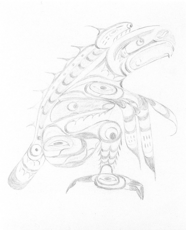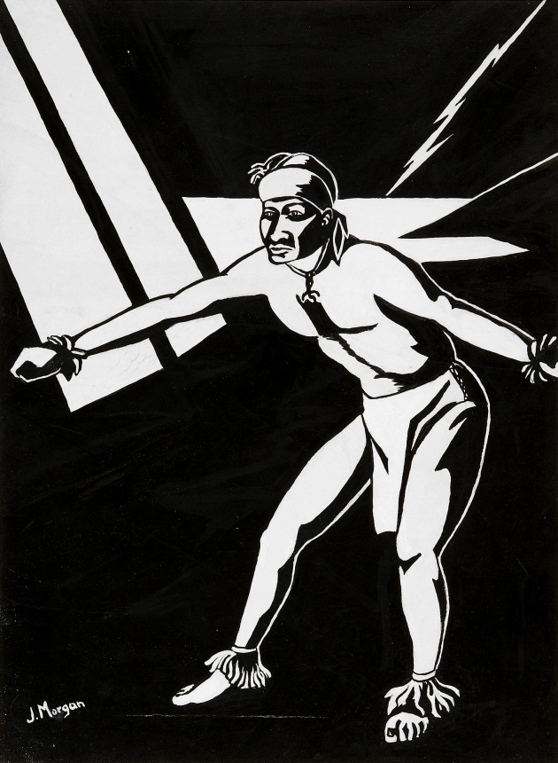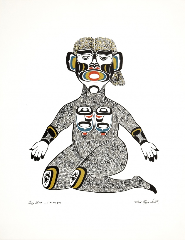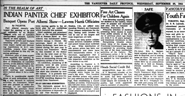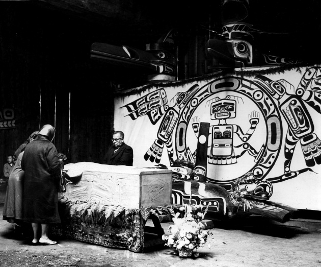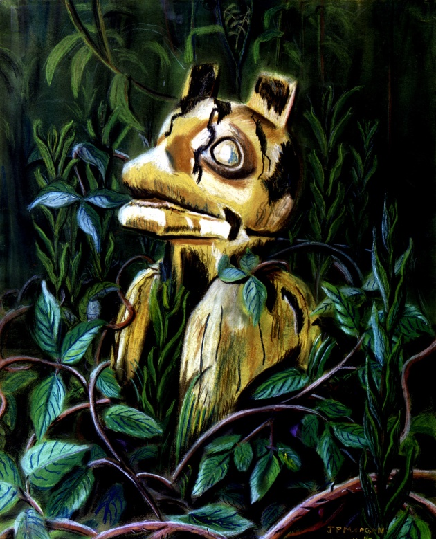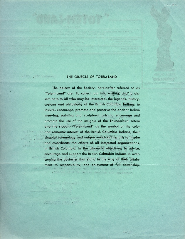 In the 1920s, when the “disappearance” of totem poles became a public concern, a Totem Pole Restoration project was financed by the Department of Indian Affairs (DIA). A committee was struck with the DIA Superintendent as Chair, and Marius Barbeau, chief ethnologist of the National Museum as one of the committee members. They focused on the poles near the Upper Skeena River, the lands through which the railway ran. Subsequently, the first of seven poles were cut down and put in cement blocks along the railway to promote tourism. During Barbeau’s work on the Skeena, he invited various artists to paint a “dying” way of life. An exhibition in Ottawa of their paintings, Canadian West Coast Art: Native and Modern, was curated by Barbeau and Eric Brown, director of the National Gallery, in 1927.