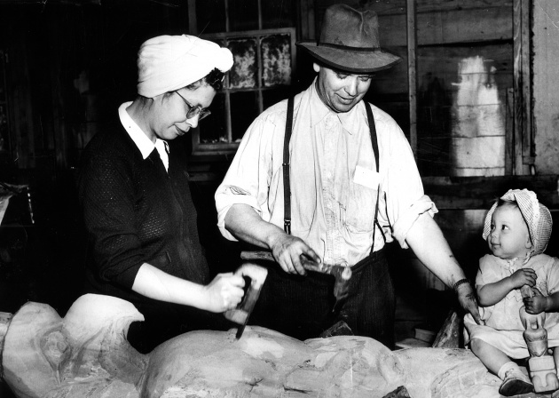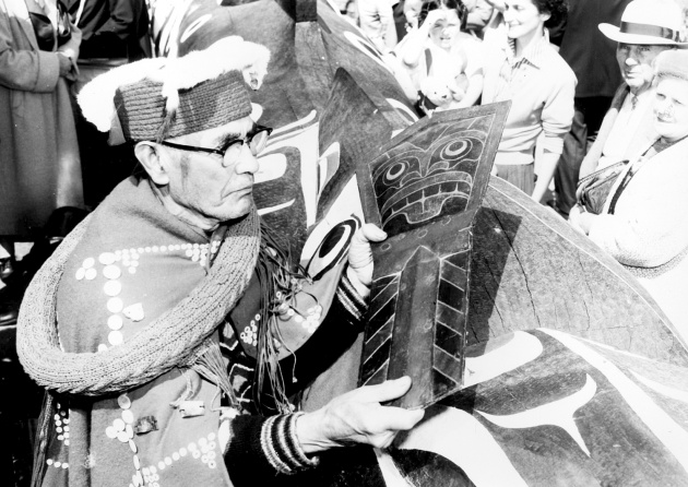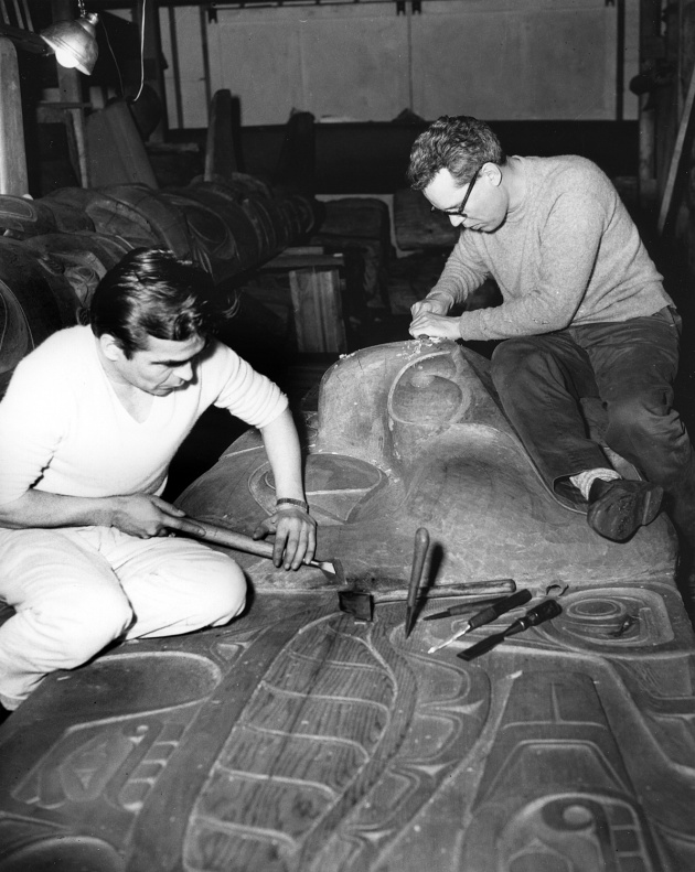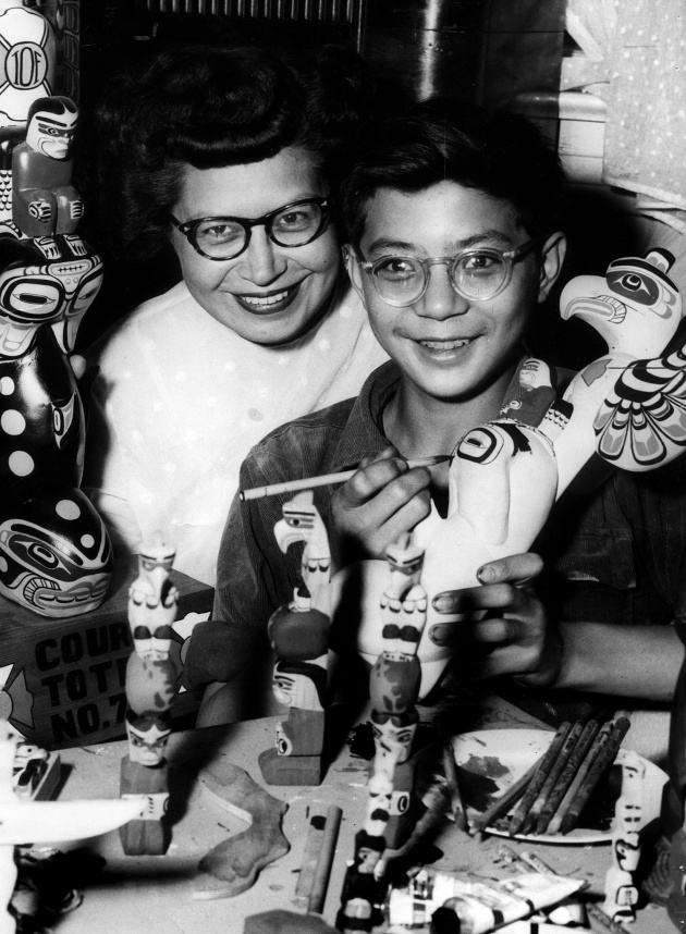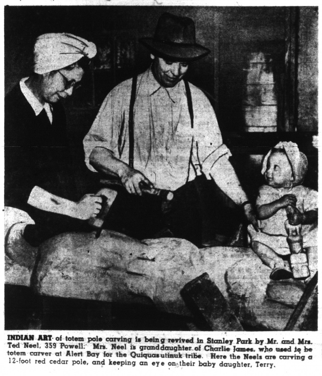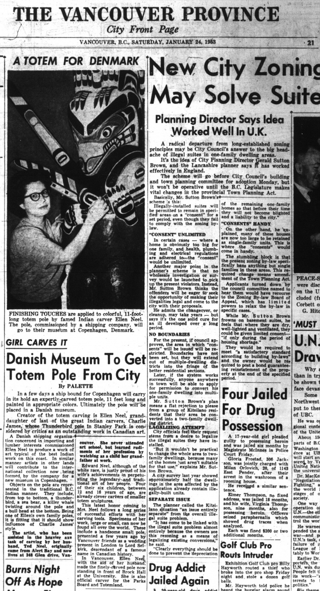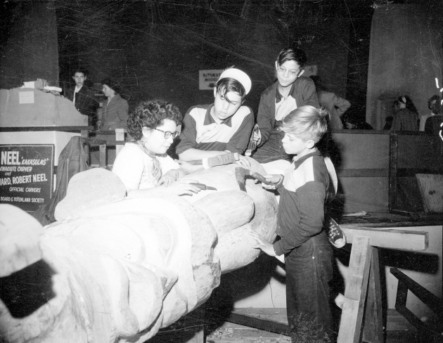 Three decades later, the 1950s tourism venture, “Totem Land,” (an organization to protect Indian Art and promote goodwill) and the 1966 “Route of the Totem,” poles erected along highways and at ferry terminals, and on-going totem pole restoration programs at the Royal British Columbia Museum and UBC Museum of Anthropology provided a renewed interest in poles. Despite the huge historical gap between these projects, the initiatives reveal a relationship between totem poles, tourism, Canadian nationalism and art. Against this more recent historical backdrop, Ellen Neel was named as ‘renowned for her totem poles’ in a display hosted by the Coqualeetza Fellowship Club at the Vancouver Art Gallery in 1954. By 1955 Neel was known as the “the most famous totem carver on the west coast” according to a tribute to her after her untimely death in 1966. Taught from childhood to carve totem poles as a skill that would allow her to make a living and maintain cultural knowledge, she was propelled into a capitalist market that eventually took her to Vancouver, where she mentored her own family as she had been. Neel became known as a leader who advocated for women, and who “worked shoulder to shoulder with men,” not only as a carver, but as a business woman who embarked on many political and cultural ventures in Vancouver with civic, provincial, institutional and aboriginal leaders. However, her bold embrace of what was ‘modern’ in terms of business, politics and art in the 1940s and 1950s would lead to her exclusion from the 1960s discourse of tradition, aesthetics and connoisseurship in Northwest coast art.